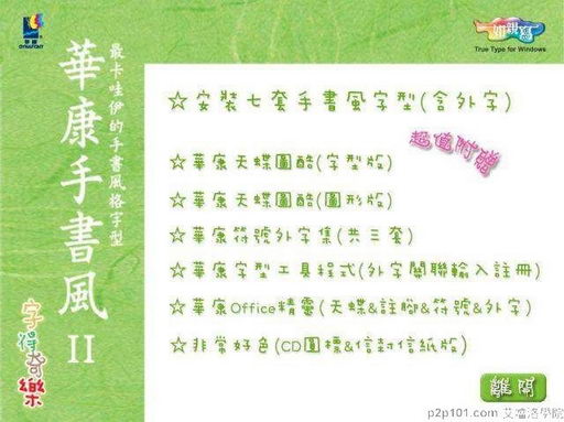 華康手風書II~字得奇樂-設計必備手寫字型 (手書風字型每套均源自真人筆跡 讓您打出來的字就和寫出來的一樣 用手書風字型在日常生活的角落 展現最親切的溝通角色) 繁體中文版