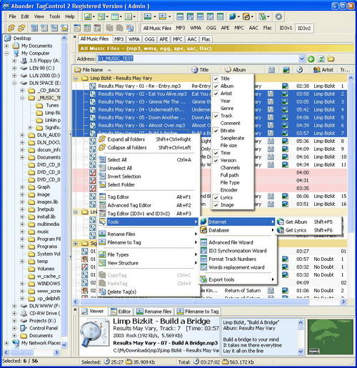方式排序、根據tag資訊進行檔重命名、從檔案名移植tag資訊、在internet查找音樂專輯資訊