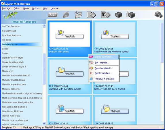 水晶、金屬、塑膠甚至XP樣式的web按鈕。 基本安裝包括25個包共150個按鈕範本供